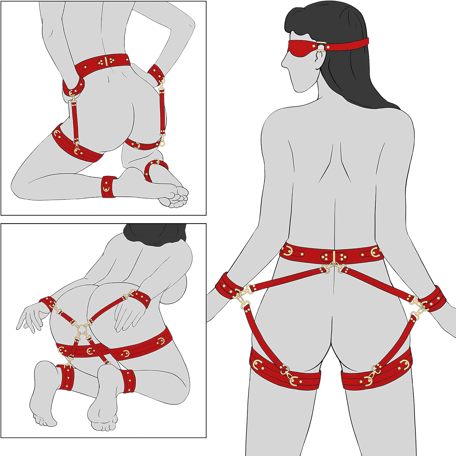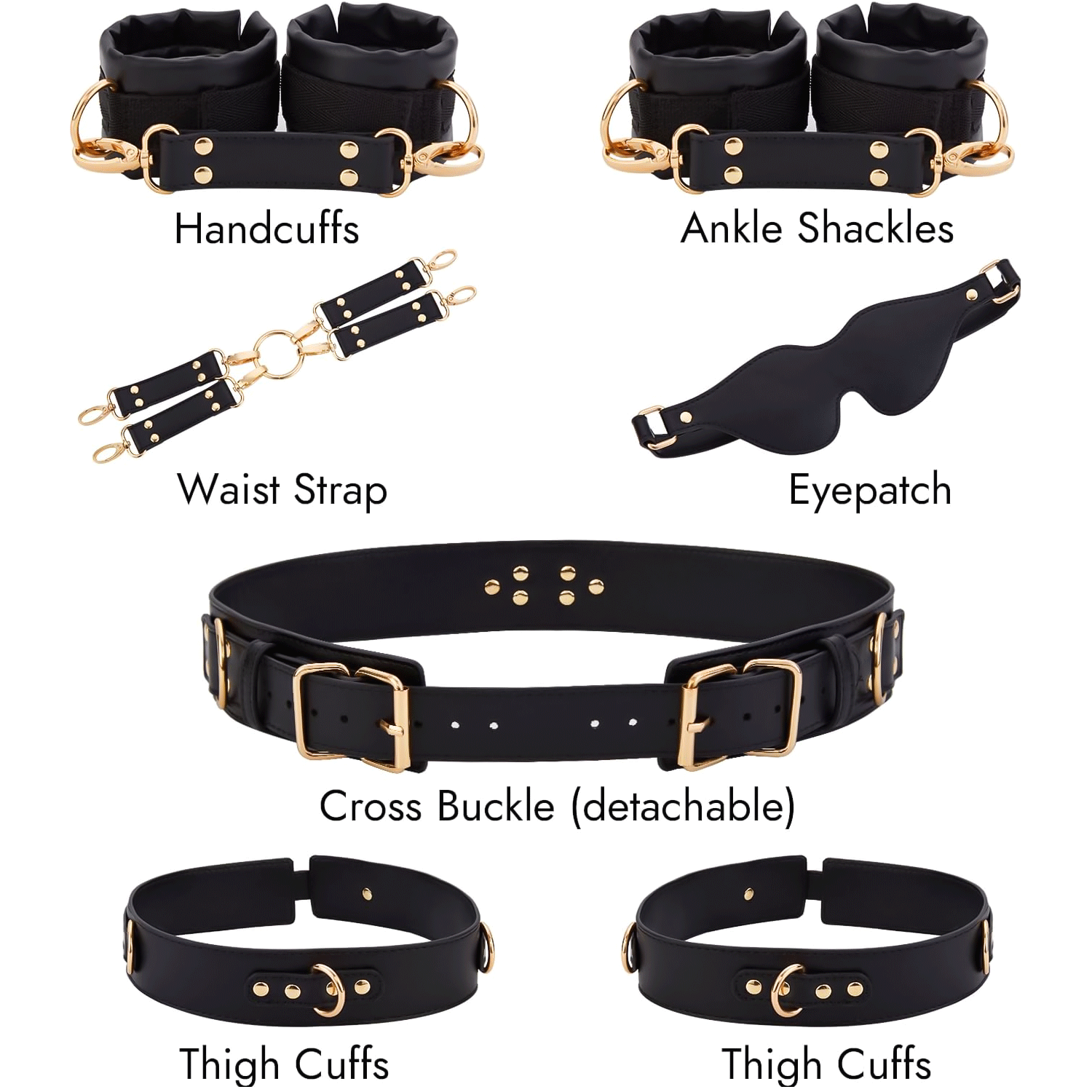 1. More ways to sex games 6PCS - This sex bondage kit consists of 6 accessories in total (1x waist belt, 2x handcuff, 2x ankle cuffs, 2X thigh cuff, 1x blindfold, 1x cross strap)light soft sexy eyepatch, those couples sex set are adjustable, so it can fit almost all people size.Made of superior leather and nylon material, safe and comfortable.